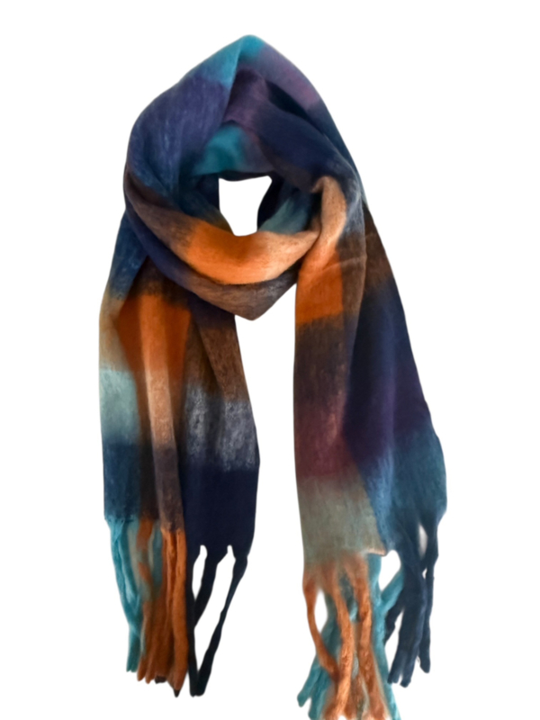 Artikelnummer: VC4226 OverzichtMooie warme geblokte winter sjaal die je moeiteloos door de koude winter helpt! Gebreide sjaal van 230 cm (inclusief franjes) / 195 cm (exclusief franjes) x 40 cm. Blokdessin in de kleuren lichtblauw, donkerblauw, oranje, roze en paars (zie afbeelding).