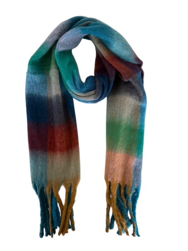 Mooie warme geblokte winter sjaal die je moeiteloos door de koude winter helpt! Gebreide sjaal van 230 cm (inclusief franjes) / 195 cm (exclusief franjes) x 40 cm. Blokdessin in de kleuren lichtblauw, donkerblauw, rood, bordo en groen (zie afbeelding).