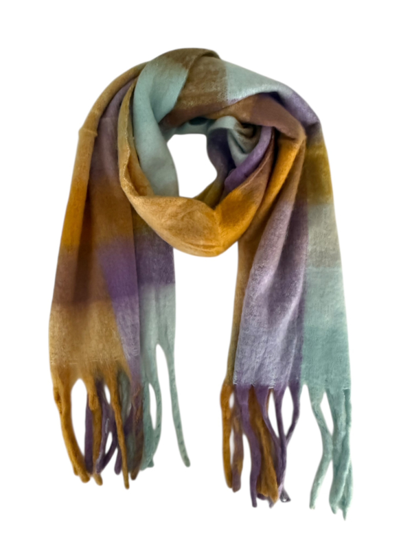 Artikelnummer: VC8927 OverzichtMooie warme geblokte winter sjaal die je moeiteloos door de koude winter helpt! Gebreide sjaal van 230 cm (inclusief franjes) / 195 cm (exclusief franjes) x 40 cm. Blokdessin in de kleuren lichtgroen, paars en camel (zie afbeelding).